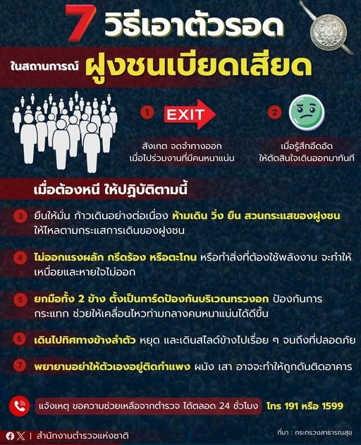 สำนักงานตำรวจแห่งชาติห่วงใยพี่น้องประชาชน ขอแนะนำ 7 วิธีเอาตัวรอด เมื่ออยู่ในสถานการณ์ฝูงชนแออัดเบียดเสียด จำไว้ประยุกต์ใช้เพื่อความปลอดภัย