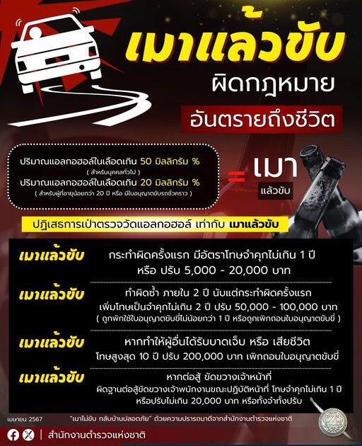 เมาแล้วขับ – หากทำให้ผู้อื่นได้รับบาดเจ็บ หรือ เสียชีวิต โทษสูงสุด 10 ปี ปรับ 200,000 บาท เพิกถอนใบอนุญาตขับขี่