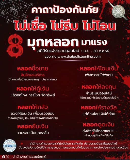 หนึ่งในมาตรการป้องกันที่สำคัญ คือสร้างการรับรู้ ให้ประชาชนมีเกราะป้องกัน เป็น #วัคซีนไซเบอร์ ให้รู้เท่าทันกลลวงหลายรูปแบบ ซึ่งจากสถิติการรับ #แจ้งความออนไลน์ ทาง www.thaipoliceonline.com ตั้งแต่ 1 มกราคม – 30 ตุลาคม 2566 พบ 8 รูปแบบการหลอกลวง ที่สร้างความเสียหาย 8 อันดับแรก