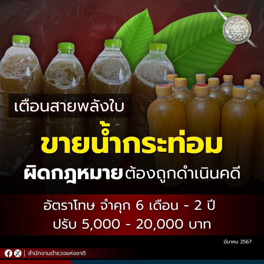 เตือนสายพลังใบ ขาย “น้ำกระท่อม” ผิดกฎหมาย ต้องถูกดำเนินคดี มีอัตราโทษจำคุก 6 เดือน – 2 ปี ปรับ